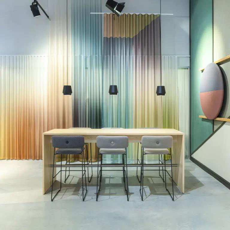 Van Tol treated the space like a stage set, making the architects and designers the performers. They can take a seat at a workstation, comfortably taking their time to browse through Vescom’s materials and make selections. They can connect with clients and partners in a design-focused setting to be inspired by the solutions on show. ‘Vescom’s “material lab” is a meeting place for professionals who work with textiles and wallcovering for all kinds of contract environments,’ says Janne Wetterlind, managing director of Vescom Scandinavia. ‘Here you can sit down, be inspired and play with all kinds of coordinated materials and colours, and immediately see a project come together. The whole idea is about simplicity and ease.’